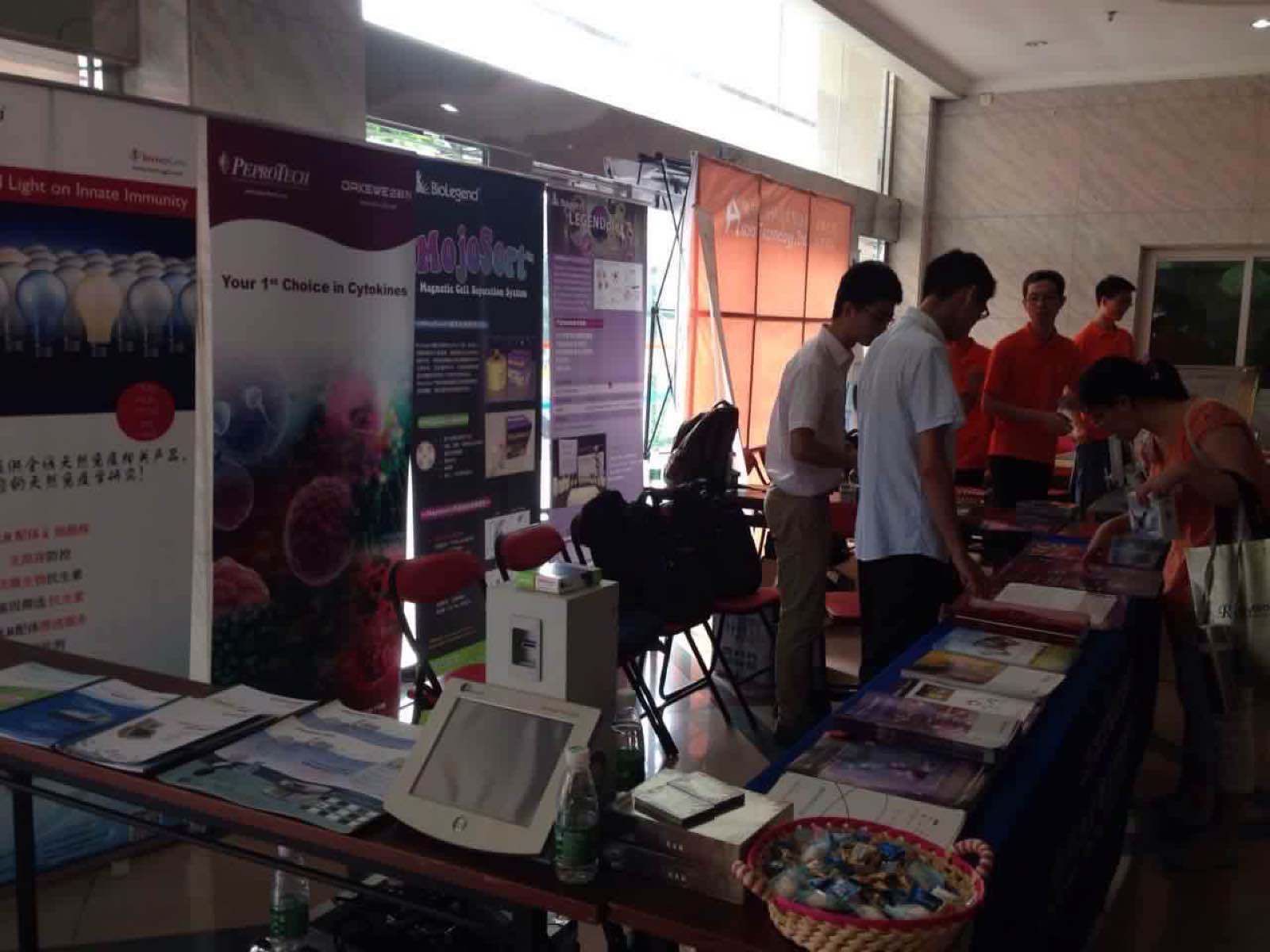 我司在A1號展臺,準(zhǔn)備了5副免疫殺撲克牌供展覽用,同時(shí)帶來公司的產(chǎn)品目錄冊以及免疫組(小彩圖:mechanisms of cell death,DC、巨噬細(xì)胞,中彩圖:Breg,Treg,th17)等資料以及細(xì)胞組的轉(zhuǎn)染、細(xì)胞治療組的PPT和儀器彩頁等資料供參會(huì)人員瀏覽,展臺的兩邊我們放置了多因子、磁珠分選等3個(gè)易拉寶供參會(huì)人員觀看,技術(shù)部同事現(xiàn)場進(jìn)行技術(shù)儀機(jī)器演示。