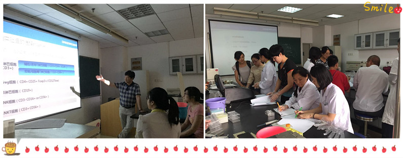 達科為生物第三屆流式培訓班——武漢分站實驗上機培訓于10月24-25日在華中科技大學同濟醫(yī)學院基礎2號樓9層進行。本次實驗內容為人外周血的T/B/NK/NKT/Treg的流式檢測,流式細胞儀型號為BD LSRⅡ,為雙激光六色儀器,本次實驗panel共分成兩組,一組檢測T/B/NK/NKT,一組檢測Treg。實驗采取小組教學,上機學員共計60人。