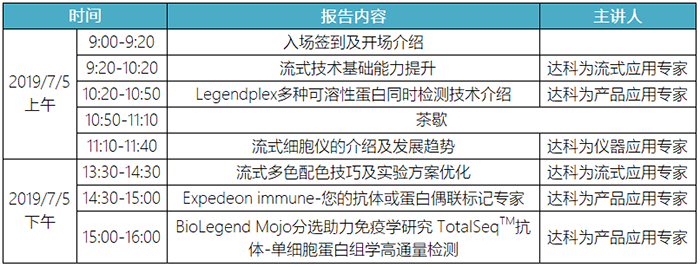 達(dá)科為生物公司作為國內(nèi)一流的生物試劑供應(yīng)商,多年來在全國各地免費(fèi)舉辦了百余場流式培訓(xùn)班,取得了熱烈的反響和良好的反饋。此次流式培訓(xùn)班將于2019年7月5日-7月7日舉辦。