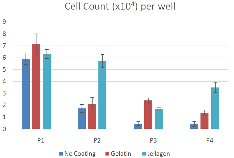 Jellagen膠原蛋白不僅具有良好的細(xì)胞兼容性、細(xì)胞粘附性,還可以為細(xì)胞提供充分的營養(yǎng)。在基質(zhì)支持軟骨細(xì)胞生長過程中,Jellagen膠原上生長的軟骨細(xì)胞同在牛明膠上生長的軟骨細(xì)胞比較,細(xì)胞在P4時存活率更高。