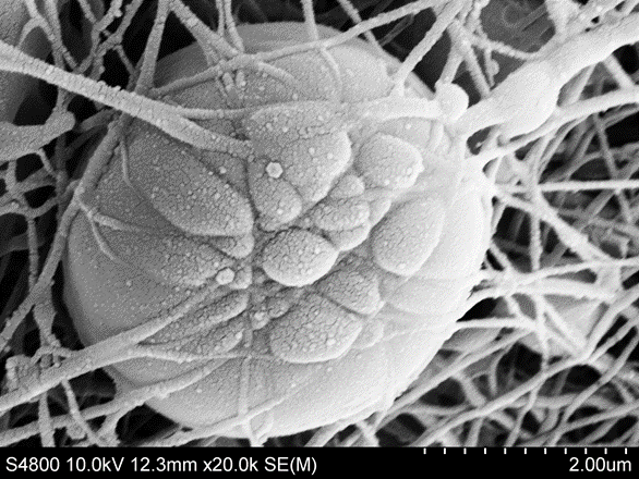 水母膠原蛋白經(jīng)靜電紡絲技術(shù)生產(chǎn)出的納米纖維墊,軟骨細(xì)胞嵌入100nm-200nm纖維叢中。該纖維與天然細(xì)胞外基質(zhì)(ECM)相當(dāng),表明Jellagen膠原蛋白納米纖維提供了細(xì)胞生長理想的環(huán)境。