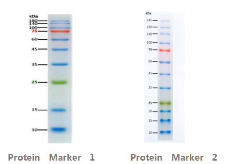 BioSciTM ColorBandTM Prestained Protein Marker 是一種三色預(yù)染的即用型蛋白分子量標準品,包括十種分子量從的預(yù)染重組蛋白,經(jīng)SDS-PAGE凝膠電泳或轉(zhuǎn)膜后可觀察到清晰的彩色蛋白條帶,其中25KD為綠色條帶,75KD為紅色條帶,其余條均為藍色條帶。