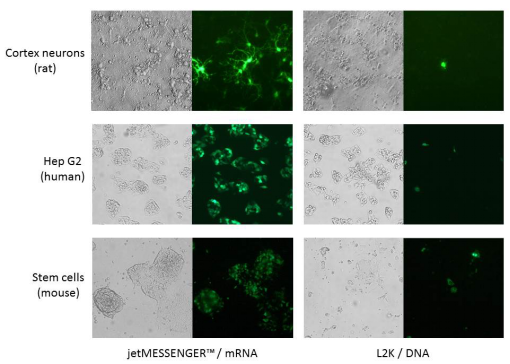 mRNA轉(zhuǎn)染是針對難轉(zhuǎn)染細胞如神經(jīng)元、原代細胞和懸浮細胞(淋巴細胞)的一種新的解決方法。這種轉(zhuǎn)染方法相較于DNA轉(zhuǎn)染有很多優(yōu)點:更高的轉(zhuǎn)染效率、轉(zhuǎn)染后更快速的蛋白表達以及較低的基因插入突變風(fēng)險。mRNA瞬時轉(zhuǎn)染可用于很多用途,包括細胞重編輯,基因編輯(CRISPR/Cas9)及疫苗研發(fā)。Polyplus-transfection?公司研發(fā)了一款新型的mRNA轉(zhuǎn)染試劑jetMESSENGERTM,難轉(zhuǎn)染細胞現(xiàn)在很容易轉(zhuǎn)染!