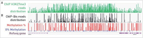 圖3 A: 使用Diagenode的iDeal ChIP-seq Kit對人細(xì)胞系Gm12878 H3K27me3標(biāo)記的組蛋白進(jìn)行染色質(zhì)免疫沉淀;B: 使用Premium WGBS Kit對ChIP’d DNA進(jìn)一步處理并測序。