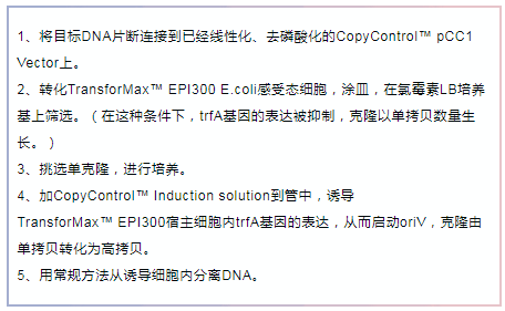 首先安利一下Epicentre的專利技術(shù)——CopyControl?克隆系統(tǒng),能夠讓您共享單拷貝和高拷貝的優(yōu)點(diǎn)。CopyControl?克?。菏紫纫詥慰截愋问缴L(zhǎng),單拷貝可以確保插入穩(wěn)定及成功克隆編碼基因序列;在需要的時(shí)候,通過誘導(dǎo)液誘導(dǎo)成高拷貝克隆,以便下游應(yīng)用所需。這一系統(tǒng)可以用來構(gòu)建PCR克隆,對(duì)于BAC,F(xiàn)osmid文庫等大型質(zhì)粒格外有用。
