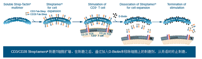 Streptamers?應(yīng)用于T細(xì)胞擴(kuò)增是目前T細(xì)胞擴(kuò)增術(shù)中一項(xiàng)較新穎的技術(shù)。該技術(shù)的核心在于:將抗CD3和抗CD28的Fab-Streps結(jié)合到Strep-Tactin? 多聚體上,使它們形成可溶性的蛋白復(fù)合物。在刺激之后,通過(guò)加入D-Biotin來(lái)移除細(xì)胞上的刺激劑,從而適時(shí)終止刺激。