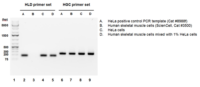 HeLa基因組DNA(gDNA)檢測(cè)引物組分(HLD)識(shí)別并擴(kuò)增基因組中不存在于其他人類(lèi)細(xì)胞的HeLa細(xì)胞特異性序列。