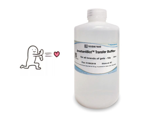 當(dāng)然蛋白電泳只是WB實驗的第一步,那還有什么方法能加快后續(xù)實驗(如轉(zhuǎn)膜)進(jìn)程呢?別急,今天就給大家介紹一款來自分子產(chǎn)品專家Expedeon公司的快速轉(zhuǎn)膜液——InstantBlot?Transfer Buffer(貨號:NXB87500),作為Expedeon的一款專利產(chǎn)品,該轉(zhuǎn)膜液能夠大幅提升蛋白從“膠”至“膜”的轉(zhuǎn)移速度,最快只需10 min即可完成轉(zhuǎn)膜,并且不會產(chǎn)生過多的熱量,避免影響蛋白的后續(xù)檢測。