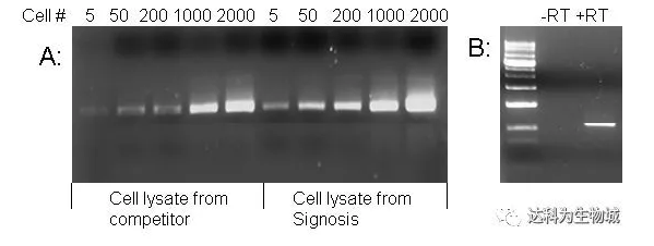 圖2 A: 比較Signosis與其他品牌的細(xì)胞裂解液。分別對(duì)裂解產(chǎn)物中的β-actin進(jìn)行30個(gè)循環(huán)反轉(zhuǎn)錄PCR。