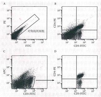 雖然死細(xì)胞位于散點(diǎn)圖的對(duì)角線(xiàn)上,但是對(duì)角線(xiàn)上的細(xì)胞確不一定是死細(xì)胞,因?yàn)殡p陽(yáng)性細(xì)胞如果在x軸和y軸的熒光信號(hào)相似時(shí),也可以位于對(duì)角線(xiàn)上。所以,散點(diǎn)圖對(duì)角線(xiàn)上的細(xì)胞可能是死細(xì)胞,也可能是雙陽(yáng)性細(xì)胞。如圖1-B所示,樣本細(xì)胞為正常小鼠脾臟細(xì)胞,標(biāo)記 FITC-抗CD3抗體和PE-抗CD4抗體,F(xiàn)ITC和PE雙陽(yáng)性的CD4 T細(xì)胞和死細(xì)胞混在一起,無(wú)法區(qū)分。但是死細(xì)胞和雙陽(yáng)性細(xì)胞的形狀是不一樣的,死細(xì)胞呈現(xiàn)連續(xù)的線(xiàn)型分布,而雙陽(yáng)性細(xì)胞群呈現(xiàn)圓形的群體分布,因此,可以從對(duì)角線(xiàn)上的細(xì)胞群體的形狀大致判斷細(xì)胞的性質(zhì)。雖然不能根據(jù)熒光強(qiáng)度的強(qiáng)弱來(lái)區(qū)分該熒光信號(hào)是來(lái)自于死細(xì)胞的非特異性熒光還是來(lái)自熒光素產(chǎn)生的熒光,但是可以利用在散點(diǎn)圖上死細(xì)胞位于對(duì)角線(xiàn)的特點(diǎn)來(lái)區(qū)分死細(xì)胞和陽(yáng)性活細(xì)胞。如圖1-C所示,x軸表示FITC通道(樣本細(xì)胞標(biāo)記有FITC-抗CD3抗體),y軸表示APC通道(閑置通道),借用該散點(diǎn)圖可以明確區(qū)分圖1-B中無(wú)法區(qū)分的死細(xì)胞和雙陽(yáng)性細(xì)胞。此時(shí)只需要將排除了死細(xì)胞后的CD3 T細(xì)胞設(shè)門(mén),將門(mén)內(nèi)的細(xì)胞顯示于新的FITC-PE散點(diǎn)圖中,如圖1-D,此時(shí)該散點(diǎn)圖內(nèi)的細(xì)胞都是活細(xì)胞,因?yàn)闃颖炯?xì)胞同時(shí)標(biāo)記有PE-抗CD4抗體,所以圖中的細(xì)胞明顯分為兩群,雙陽(yáng)性的是CD4T細(xì)胞,單陽(yáng)性的是CD8 T細(xì)胞。