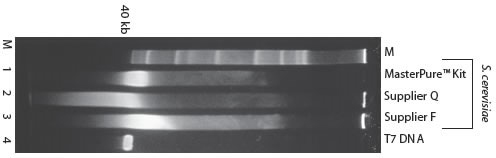 1%瓊脂糖膠電泳分析不同試劑盒提取純化啤酒酵母的500ng DNA,使用EB進(jìn)行染色。用MasterPure? Kit分離的DNA的大小絕大多數(shù)在40-50 kb范圍內(nèi)。用其它試劑盒提取的DNA會降解成更小的片段。