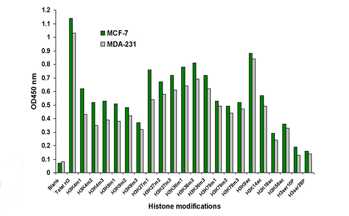 該試劑盒檢測H3修飾位點:H3K4me1 、H3K4me2、H3K4me3、H3K9me1、H3K9me2 、H3K9me3、H3K27me1、H3K27me2、H3K27me3、H3K36me1、H3K36me2、H3K36me3、H3K79me1、H3K79me2、H3K79me3、H3K9ac、H3K14ac、H3K18ac、H3K27ac、H3K56ac、H3ser10P、H3cit、TotalH3