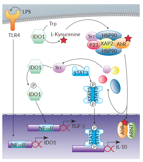AhR參與調(diào)節(jié)促炎反應(yīng)和耐受反應(yīng)的機(jī)制可以從多方面解釋,除了前文提過可以導(dǎo)致IL-22產(chǎn)生的典型AhR信號(hào),AhR也通過非基因組途徑導(dǎo)致至少兩個(gè)抑制性效果。研究發(fā)現(xiàn)與AhR相關(guān)的Src激酶能夠磷酸化吲哚胺2,3-雙加氧酶(IDO1),進(jìn)而激活NF-κB轉(zhuǎn)錄因子誘導(dǎo)DCs中抑制性細(xì)胞因子TGF-β(transforminggrowth factor)的轉(zhuǎn)錄,達(dá)到抑制小鼠對(duì)LPS的過度應(yīng)答9。此外, IDO1對(duì)Trp的降解提供了例如L-型犬尿氨酸(L-Kynurenine)的AhR激動(dòng)劑,提示了這通路與Treg的產(chǎn)生有關(guān)9。在巨噬細(xì)胞中,AhR另一個(gè)抑制作用是在LPS誘導(dǎo)下,AhR協(xié)同Src激酶和STAT3信號(hào)通路產(chǎn)生抗炎細(xì)胞因子IL-10。值得留意的是,TLR4對(duì)LPS的識(shí)別可促進(jìn)巨噬細(xì)胞中AhR的表達(dá),但目前尚不清楚在其他模式識(shí)別受體配體刺激的情況下是否也是如此10。