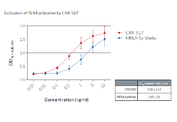 將細(xì)胞分別與遞增濃度的CRX-527、合成的單磷酰脂質(zhì)A(MPLA)孵育。在HEK-BlueTM檢測(cè)培養(yǎng)基(SEAP檢測(cè)生長培養(yǎng)基)中孵育過夜后,通過測(cè)定上清液中是否存在SEAP來評(píng)估TLR4的活化。數(shù)據(jù)表示為OD(λ=630nm)(±SEM)