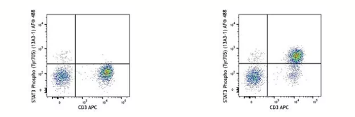 在蛋白翻譯后修飾(磷酸化、乙酰化、甲基化等)的研究過程中,固定劑不僅可以有效的“固定”住翻譯后修飾的位點(絲氨酸、蘇氨酸、酪氨酸等),也可以防止目標位點在活細胞中很快降解(比如磷酸酶會去除磷酸化修飾、去甲基化酶會移除甲基化修飾等)。下面的例子是用IL-6的重組蛋白刺激人外周血15分鐘后看STAT3第705位酪氨酸的磷酸化水平,在刺激完樣本后就需要通過固定來實現(xiàn)目的氨基酸磷酸化水平“停留”在IL-6刺激15分鐘這個節(jié)點上。