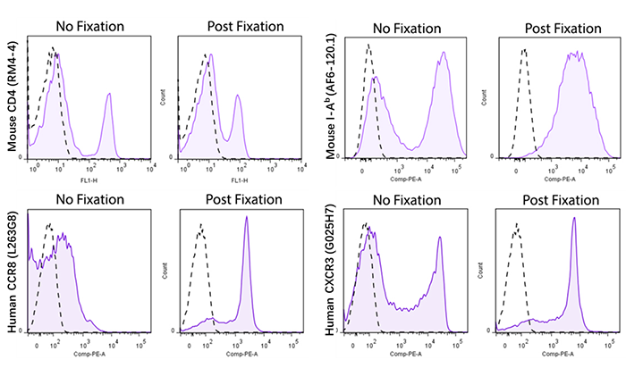 如果我們的流式實驗要求對樣本進行預先固定的處理,那實際上這就需要提前去驗證染色方案里所選的克隆是否適用于先固定后染色,這也有一定工作量。推薦大家參考借鑒BioLegend關于固定的專題,里面有做了很多克隆能否適用于先固定后染色的驗證。